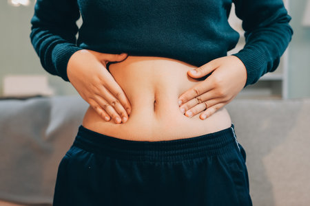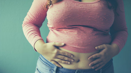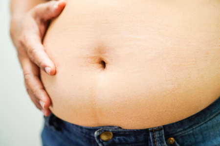 Obese Woman with fat upset about her belly. Overweight woman touching his fat belly and want to lose weight. Fat woman worried about weight diet lifestyle
