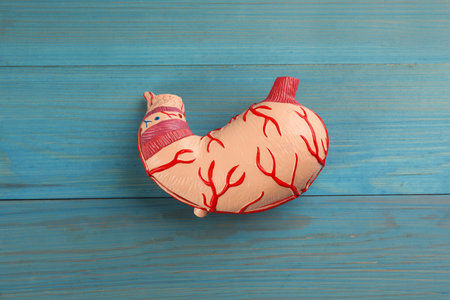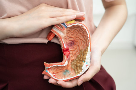 Stomach disease, doctor holding anatomy model for study diagnosis and treatment in hospital.