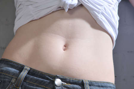Woman lifted a white t-shirt to reveal a slender belly with a belly button. Concept of a healthy lifestyle and proper nutrition.