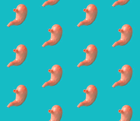 3d illustration of seamless trendy isometric objects pattern made of low poly human organ stomach. 3d illustration of faceted stomachs on turquoise background