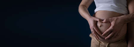The husband and wife placed their hands in the shape of a heart on a large pregnancy belly. Symbol of love. Unborn baby in the belly. Long photo frame.