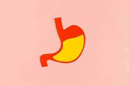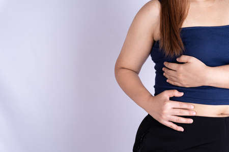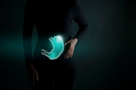 Unrecognizable female patient in white clothes, highlighted handrawn stomach in hands. Human digestive system issues concept.