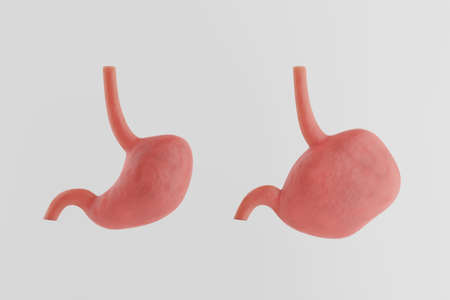 Healthy and sick stomach on a white background. Overeating, bloating concept. 3D rendering.