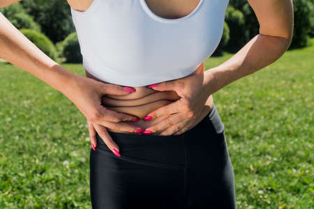 Close-up Of A Womans Hands On Her Stomach In Outdoor Background, Suffering From Stomachache