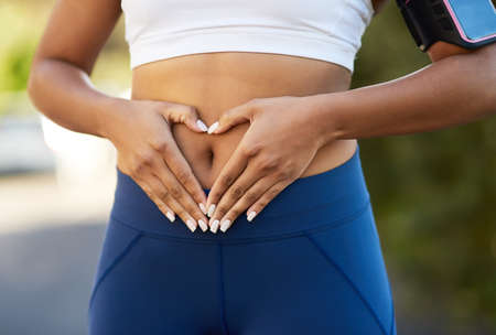 Closeup on young woman holding hands in heart shape on her belly during summer day.