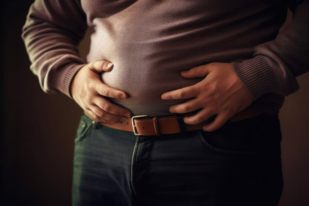 Man hold hands over his swollen abdomen in closeup view as cramp and bloating concept
