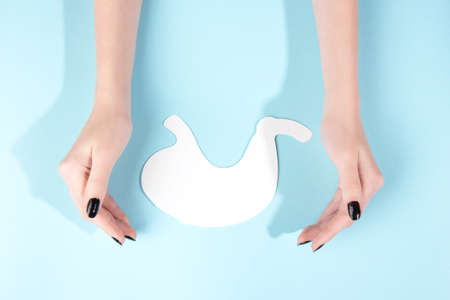 cropped shot of woman holding paper crafted stomach in hands on blue background