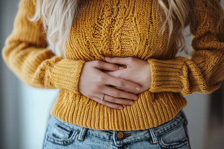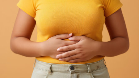 A warm and inviting close-up image of a woman in a yellow shirt gently holding her stomach, set against an orange background, evoking feelings of comfort and wellbeing.