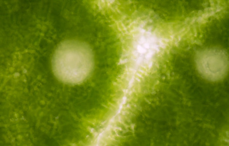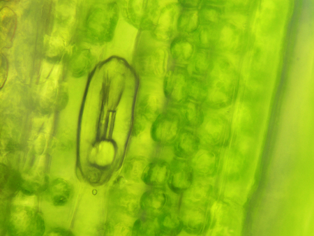 micrograph of green leaf with breathing cells stomata