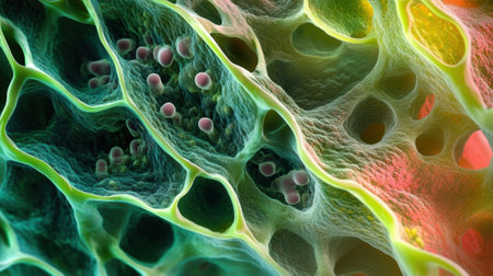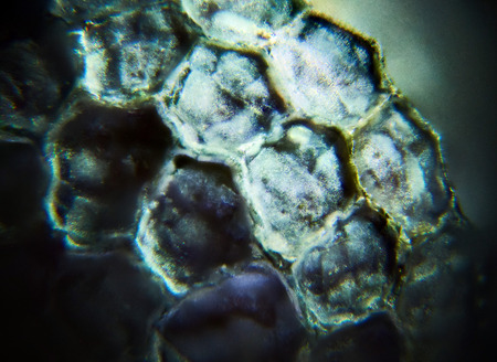 A close-up of plant cells under a microscope, showing intricate details and textures.