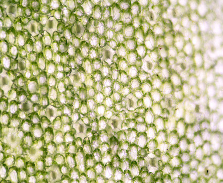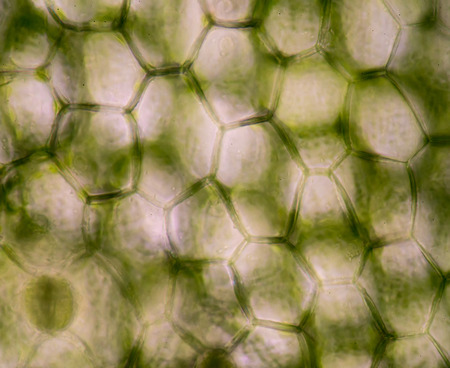 Cell structure Hydrilla, view of the leaf surface showing plant cells under the microscope for classroom education.