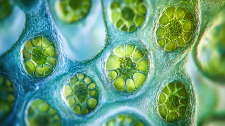 Captivating close-up of green algae cells displaying intricate bubble-like structures, showcasing the beauty of microscopic life in a vibrant natural setting.