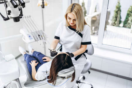 Pretty young female dentist making examination and treatment for young female patient in dental clinic
