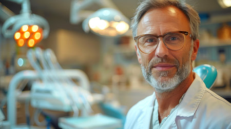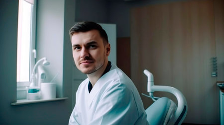 Handsome smiling male dentist posing at his dental clinic. Medicine dentistry people. Health teeth. Generative Ai technology.