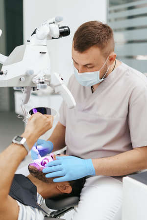 Professional young male dentist uses a microscope to treat a female patient. Modern technologies in dentistry