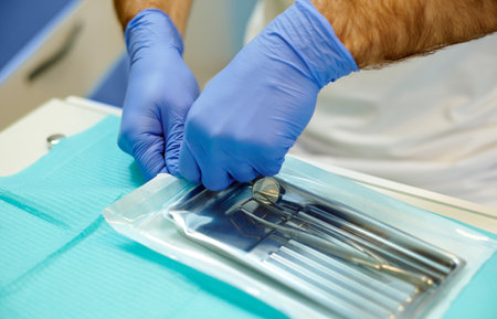 Hand's of a doctor opening a sterile bag with sterile tools for examination a patient