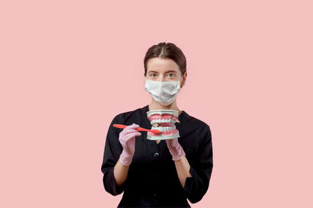 Young woman dentist in a beauty salon in a mask with an artificial jaw in her hands. Pink background.