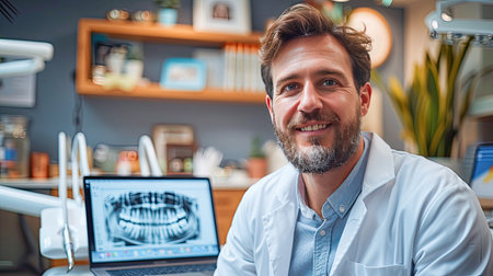 Dentist look at laptop. On the screen on the laptop is a photo of the tooth. A man is sitting in a dental office. AI Generated