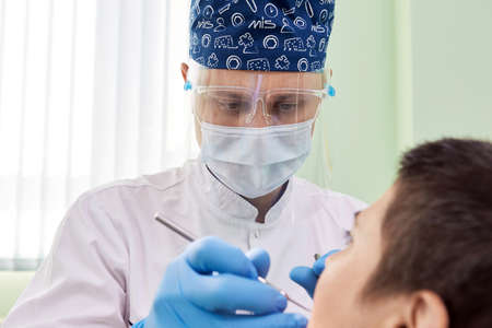 Closeup photo shoot of process of dental operation over small boy by expirienced dentist.