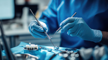 Dental instrument in hand on a white background. Dental clinic hygiene. Two hands in blue gloves.