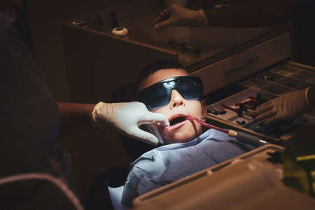 Closeup photo shoot of process of dental operation over small boy by expirienced dentist.