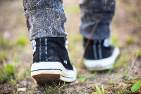 Man shoes canvas outdoor, leg man wear black and white sneakers canvas shoes and jean trouser.with copy space for text stylish street urban fashion.accessories men and women foot wear concept.