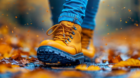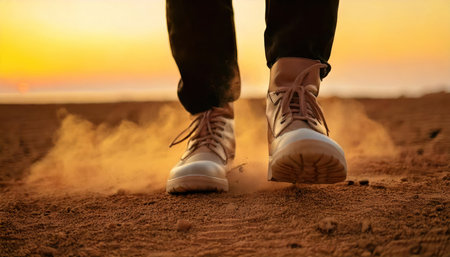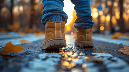 A person is walking briskly down a street, their foot kicking up dust and small debris from the pavement. The autumn light casts a warm glow, illuminating the scene with hints of fall foliage in the background.