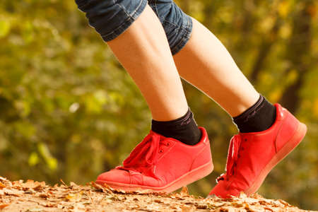Close up of woman's feet in shoes on ground. Woman in pink sneakers stands in park in summertime