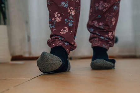 Female feet in socks and slippers are walking up the stairs. Black and white photo