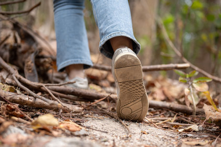 A close-up leg shot of a woman in sneakers solo hiking on the mountain. rear view. adventure, trekking, travel