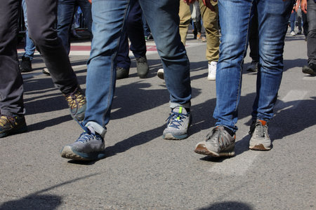 shoes and legs of many men walking in the city during the peaceful protest demonstration