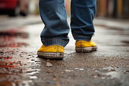the photo captures the rain-splashed soles of a man's feet, reflecting the influence of hip-hop-inspired american consumer culture. the image is characterized by jump cuts, lens flare, and draws inspiration from artists like serge marshennikov and jeff kinney. it also raises ethical concerns. ai generated
