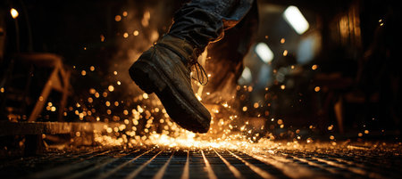 A worker in rugged boots steps over metal grates in a dimly lit workshop. Sparks fly in the background, creating dynamic action lighting in this documentary-style photograph.