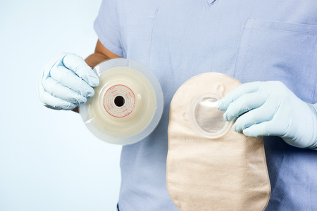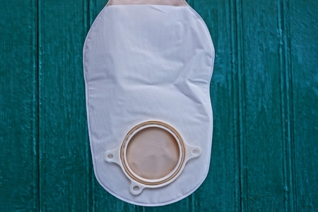 young girl holding a colonostomy near her stomach, bowel cancer concept.