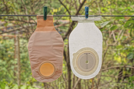 two brown and white medical colostomy bags hang on a wire in the street among green vegetation