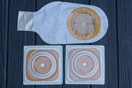 a set of three white brown medical plastic colostomy bags lie on a black wooden table