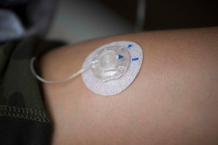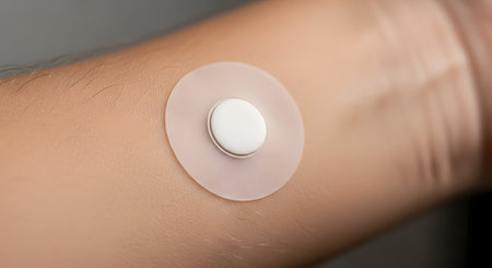 A macro close-up of a continuous glucose monitor (CGM) sensor attached to a person's arm. The small, white, circular device is fixed with a clear adhesive patch on the skin. This image represents diabetes management, modern medical technology, and health monitoring.
