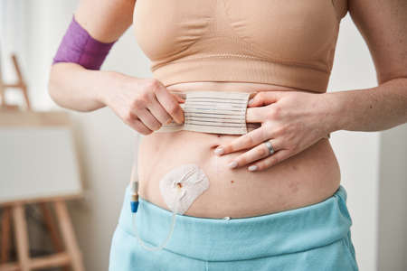 A modern medical patch for prostatitis and urinary tract infections. A man glues a urological patch on his stomach.