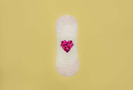 Sanitary pad with heart made of pink sequins on beige background, top view. menstrual cycle