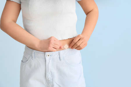 belly of a young woman with a bandage and cotton on her stomach. care navel ring piercing concept