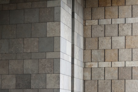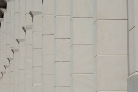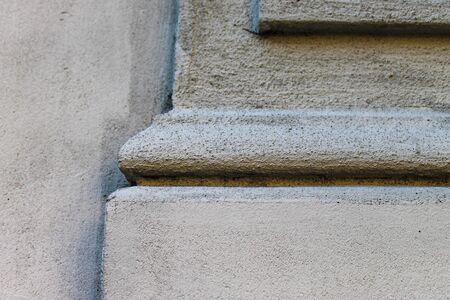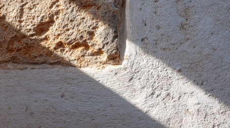 Decorative stone pillar during day time – Detail texture of a rocky structure with a side in the shadow and one in bright light – White vintage wall with a rough surface