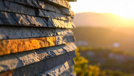 A stacked slate wall catches the warm golden light of a sunset over a blurred landscape.
