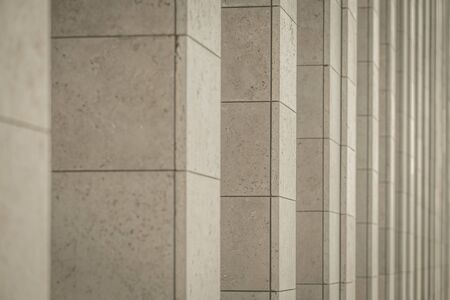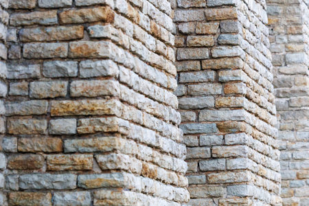 Historic stone wall with repeating vertical columns creating rhythm and depth. Natural masonry texture, perspective lines and neutral tones. Ideal architectural background, construction concept or minimalist design use.