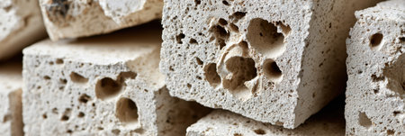 Detailed shot of stacked blocks showing their porous structure, ideal for construction projects, with variations in texture and light.