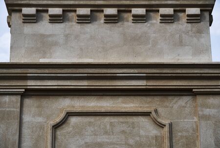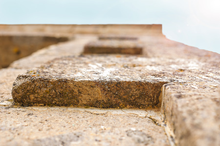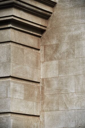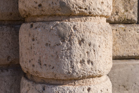 Fragment of the circular column hewn of sandstone against the stone wall in the facade of an ancient castle in sunny day