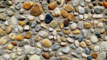 wall lined with variegated sea pebbles, background texture of gray-beige shades