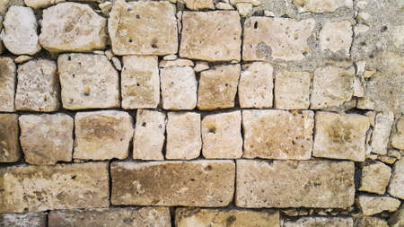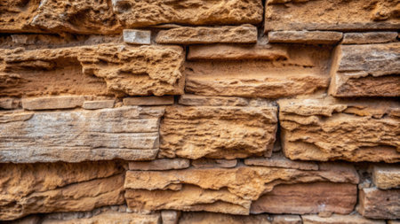 Close-up of a stone wall in warm sunlight, texture detail. Rustic architecture and design concept.