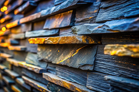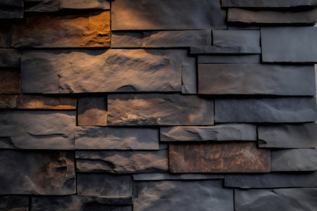 Close up of a stacked stone wall featuring varying shades of dark gray, highlighted by a warm light source creating a dramatic and textured effect