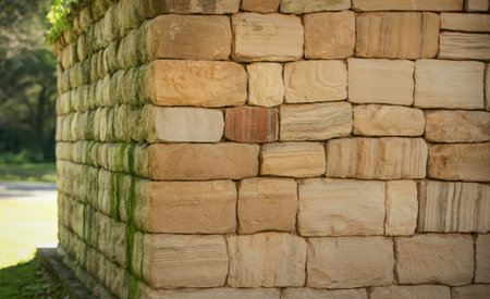 A close-up of a stone wall showcases each stones microtexture with a soft depth-of-field in natural light.