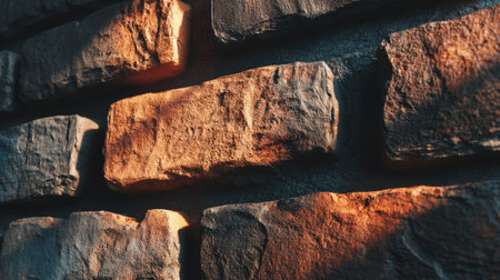 This image captures a closeup of a textured stone wall with warm lighting that enhances the rugged beauty of the bricks, perfect for diverse design projects.